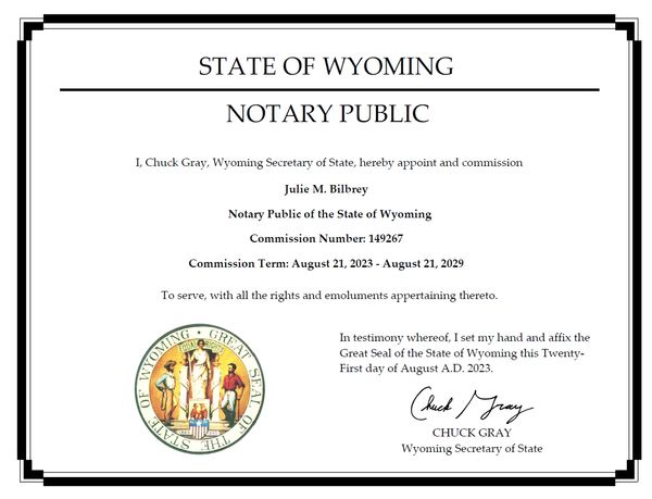I am a certified commissioned notary in the state of Wyoming. I can take care of any notarization anywhere in the world as long as I am seated in my commissioned state. So, if you are in Texas and I am in Greybull, WY, we can complete your notarization across state lines. This is the beauty of an online notary.